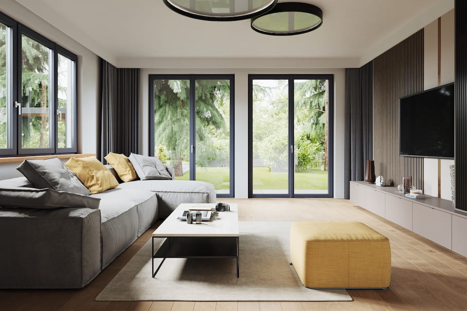 Soggiorno con porta finestra e finestre in PVC Ravia EVO di WnD