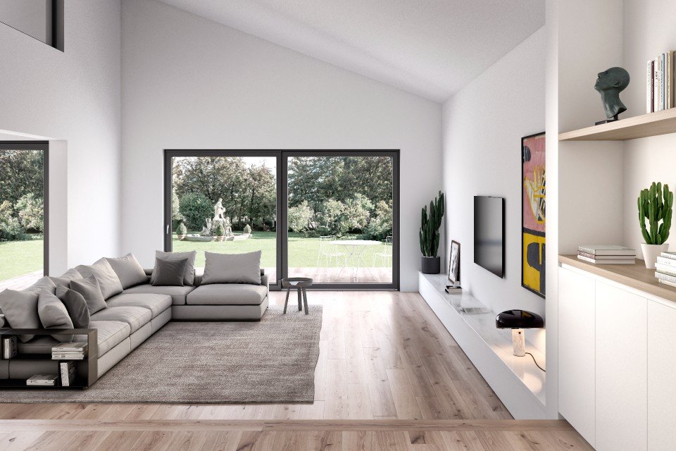 Inoltre, con l’installazione di una porta finestra scorrevole alzante la soglia sarà molto ridotta, dando anche visivamente la sensazione di uno spazio unico.